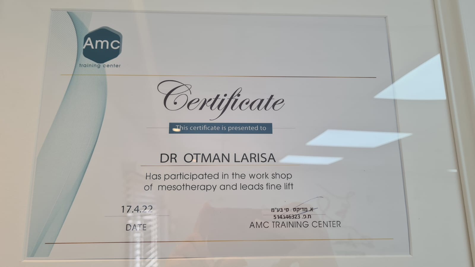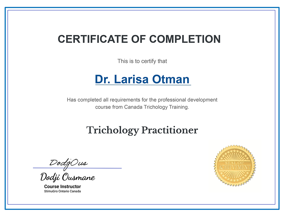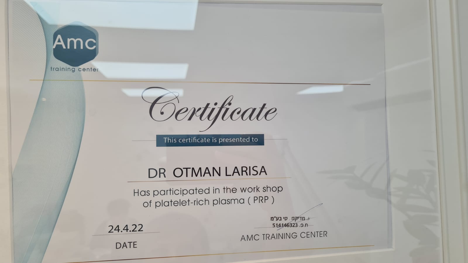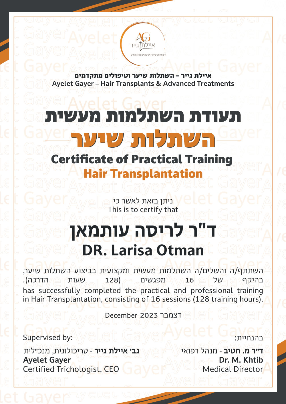 ד"ר לריסה עברה השתלמות יוקרתית בסין בטכניקות השתלות גבות בשיטה הקוריאנית, ב-Shenzhen SenTai Eyebrow Transplantation Medical, והביאה עמה ידע מתקדם וטכניקות עדכניות שהפכו אותה למובילה בתחום זה. בנוסף, היא משתתפת באופן קבוע בכנסים בינלאומיים בתחום השתלות השיער, בהם צברה ניסיון עשיר בשיטות וטכניקות מתקדמות בעולם.